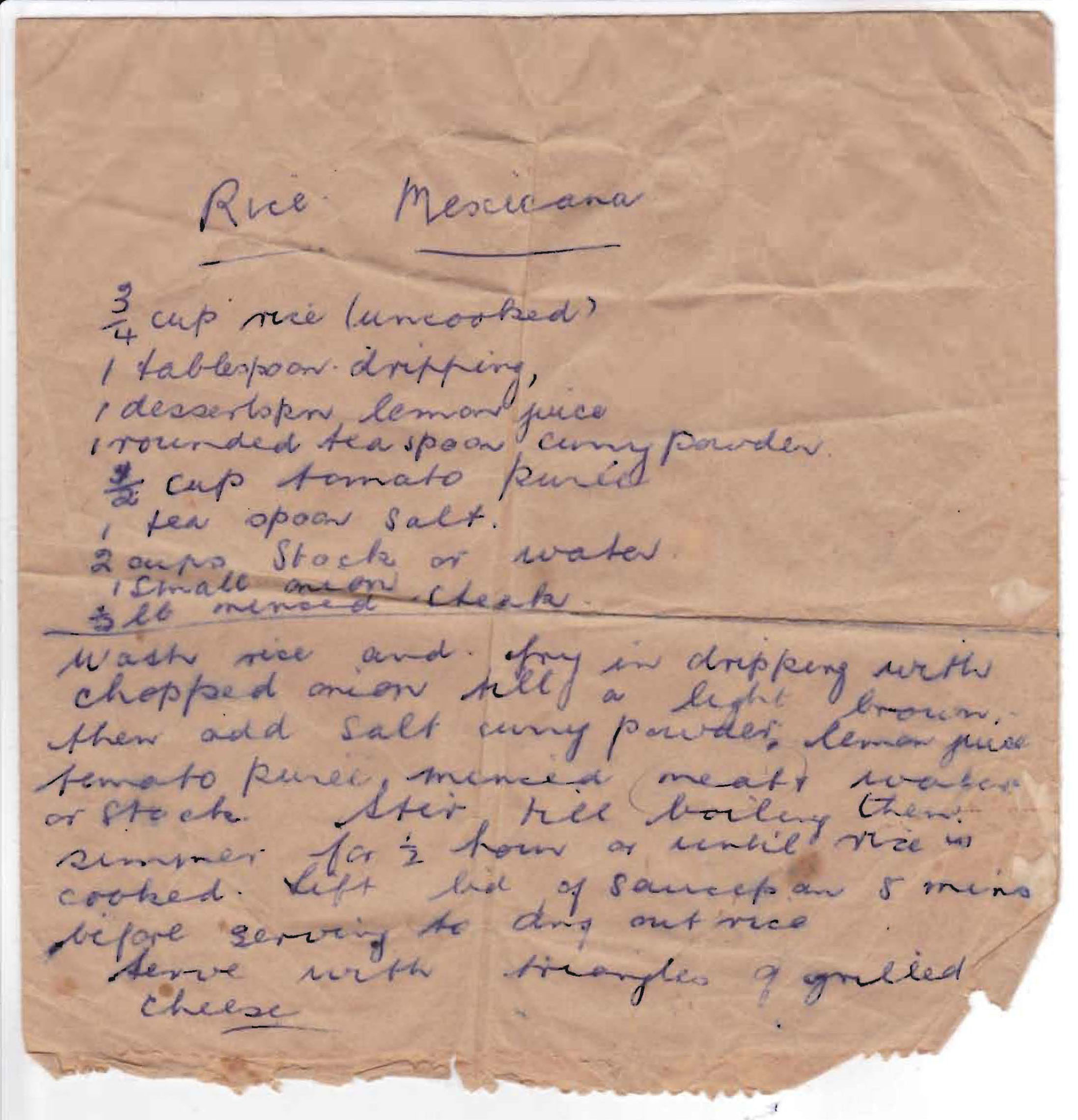 I doubt that this is even close to being a genuine Mexican recipe, but it does show the influence that “foreign” food started to have on Mum’s recipe collection. It was another Sunday night tea – easy to make, filling and tasty. I love that it was written on a brown paper bag!!
