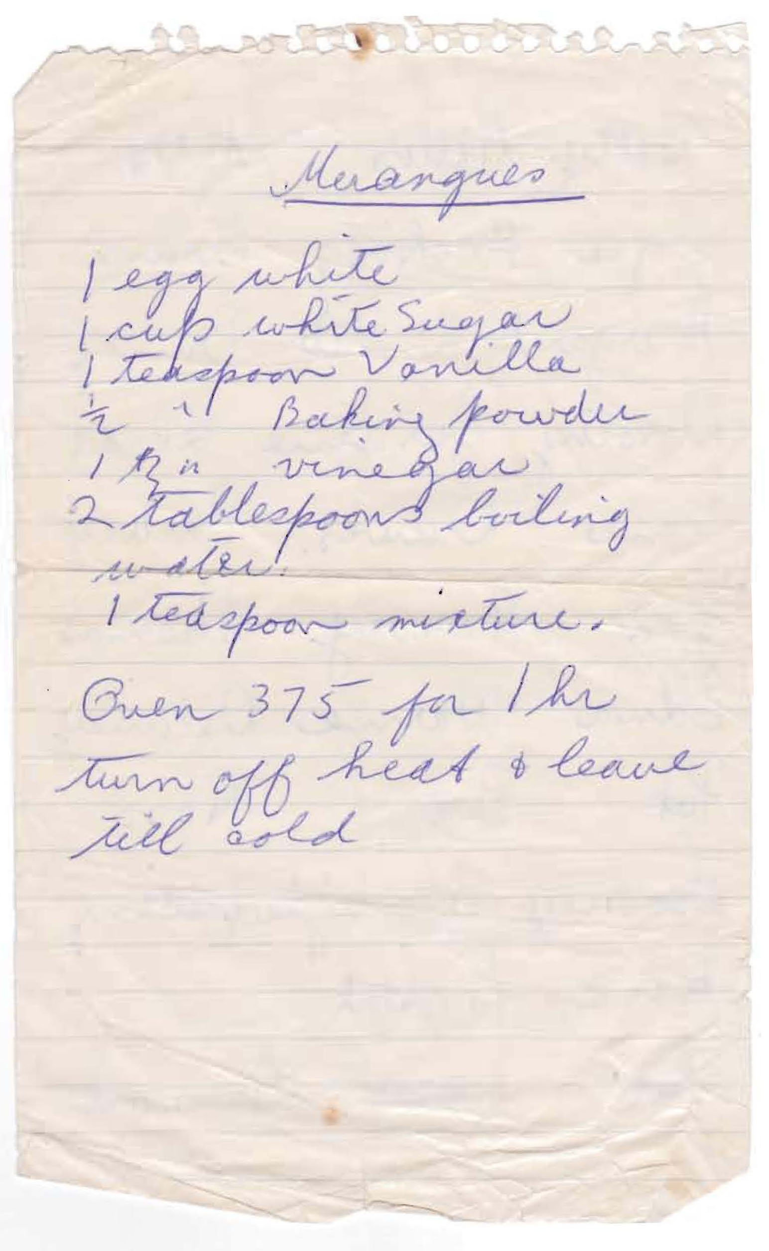 This recipe only makes a small quantity and I think Mum used it to make individual meringues that she then topped with some whipped cream and a strawberry. She would have served them at afternoon tea or supper.