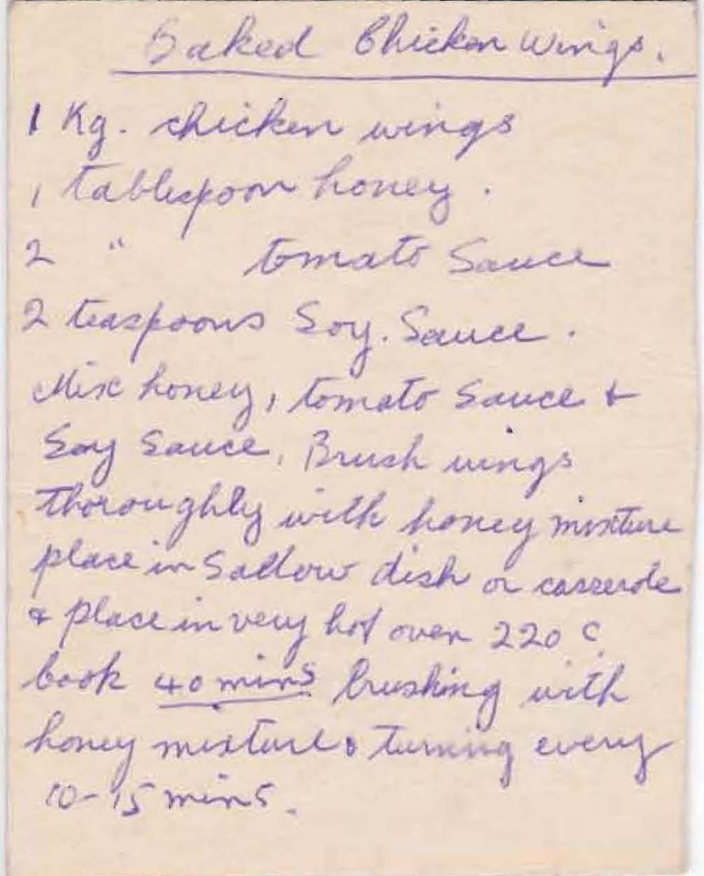 Mix honey, tomato sauce and soy sauce. Brush wings thoroughly with honey mixture place in shallow dish or casserole and place in a very hot oven 220ºC. Cook 40 mins brushing with honey mixture and turning every 10-15 minutes.