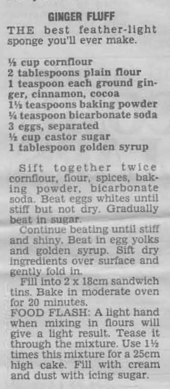Ginger Fluff Sponges were second only to a jam and cream filled sponge when I was growing up. Not everyone likes ginger, but for those who do a slice of cream filled Ginger Fluff is a real treat. This isn’t Mum’s original recipe, but one she cut out of the Herald Sun newspaper, the tip at the bottom of the recipe is might explain why my sponges never rise.