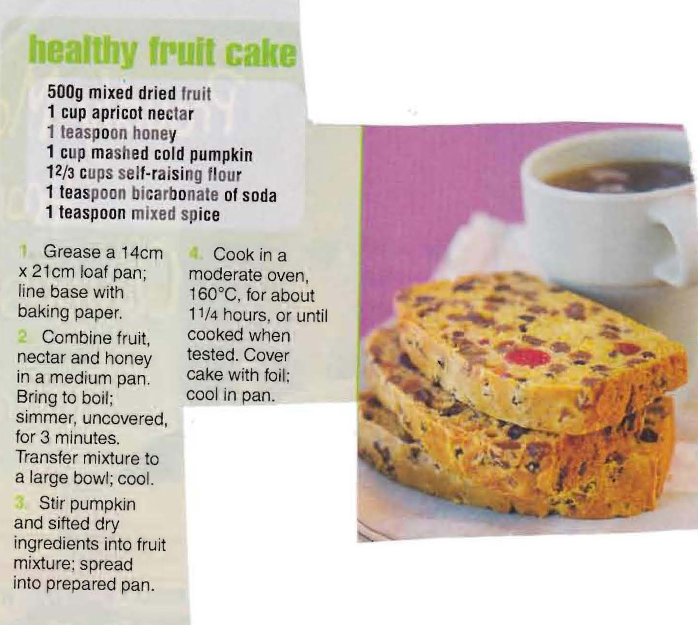 Mum made lots of different types of fruit cakes, loaves and slices and adding pumpkin to the mix wasn’t that unusual. The only unusual ingredient in this recipe is the apricot nectar, not something that you’d normally put in a fruit cake and not something you’d usually have in your cupboard. If you wanted to you could easily substitute it with fruit juice or water.