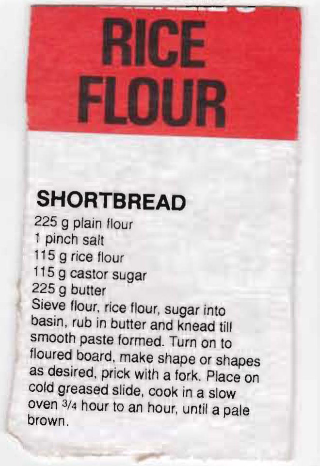 SHORTBREAD Posted on December 11, 2014 by bebsrecipes As well as lots of handwritten recipes I found this one in the collection. It comes from the side of the Rice Flour packet. Share this: Click to share on X (Opens in new window) X Click to share on Facebook (Opens in new window) Facebook Like Loading... Related