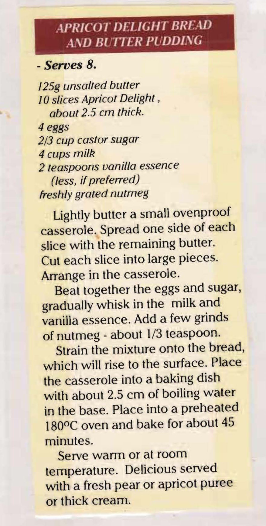 APRICOT DELIGHT BREAD AND BUTTER PUDDING Posted on March 26, 2015 by bebsrecipes Mum’s traditional Bread and Butter pudding was made with buttered white bread and a handful of sultanas. This Apricot Delight recipe goes a step further and uses apricot loaf as the base, but really any fruit bread works just as well. Share this: Click to share on X (Opens in new window) X Click to share on Facebook (Opens in new window) Facebook Like Loading... Related