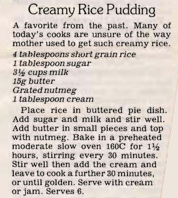 My Father’s favourite dessert was ice cream and while Mum often made that for him she made lots of other desserts as well. For some reason he had a great dislike of baked custards, but he did like rice puddings so Mum often made one for him. You can serve it with stewed fruit as well as the jam mentioned in the recipe, but it’s quite nice just on its own.