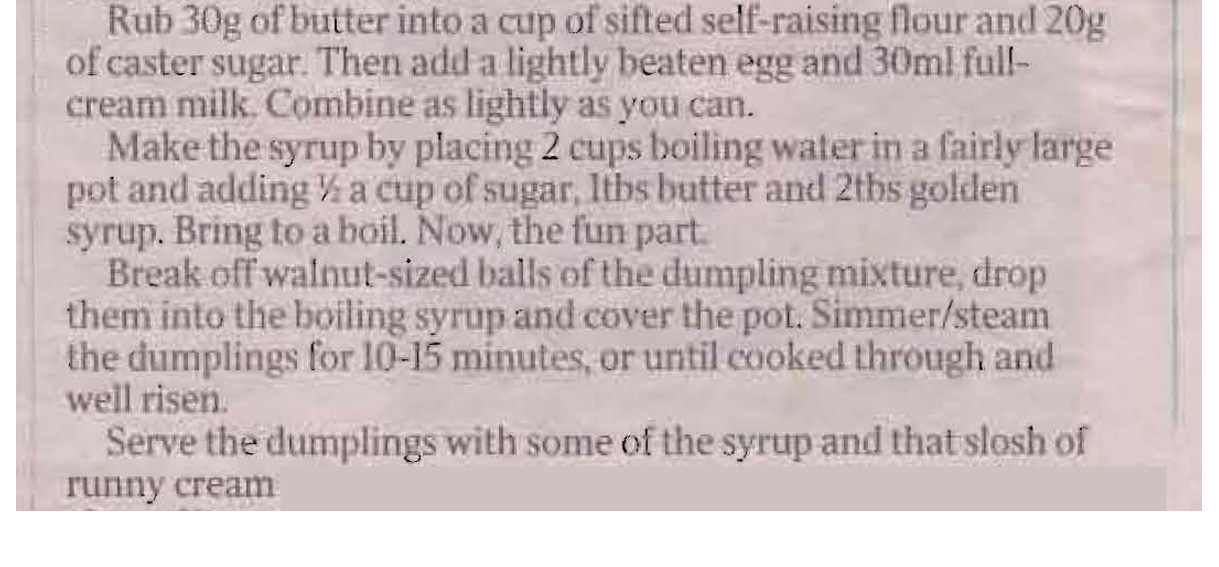 Back when I was little these were a family favourite, especially in the winter.  Now I’m older I can see why – they are sweet, filling, cheap and also quick and easy to make. They can be a bit stodgy, but a light touch will give you a light, fluffy and richly flavoured dessert, which is especially good with some runny cream on top.  Great on cold winter nights.