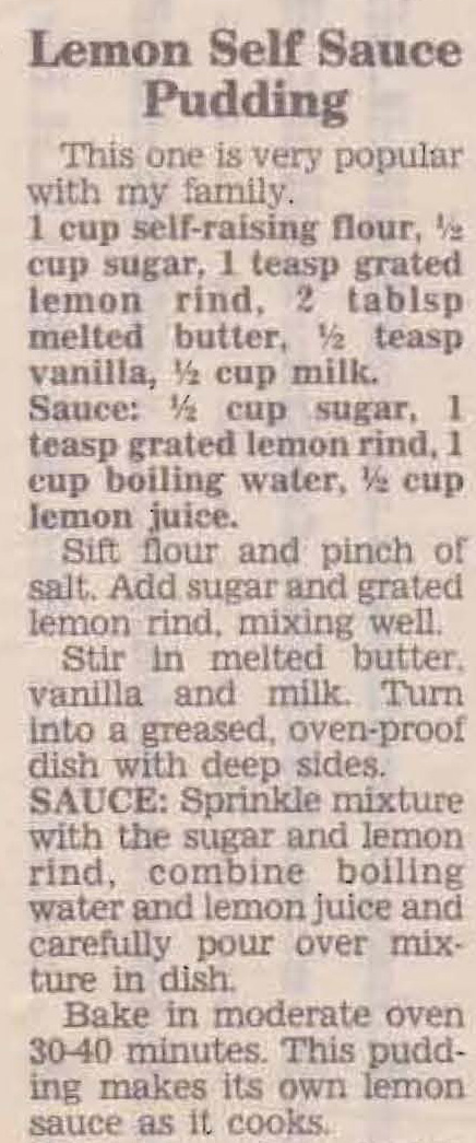 Dad was the gardener in our family. He grew tomatoes, beans, silverbeet and rhubarb in his vegie plot. There was a passionfruit vine on the back fence and, of course, a lemon tree in the corner. I think every Melbourne family had and probably still has a lemon tree in their backyard. Easy to grow and if the position is right lemons in abundance. As a result Mum made the most of it and used lemons where ever she could. This self saucing pudding was one of her yummy ways of using some of the crop.