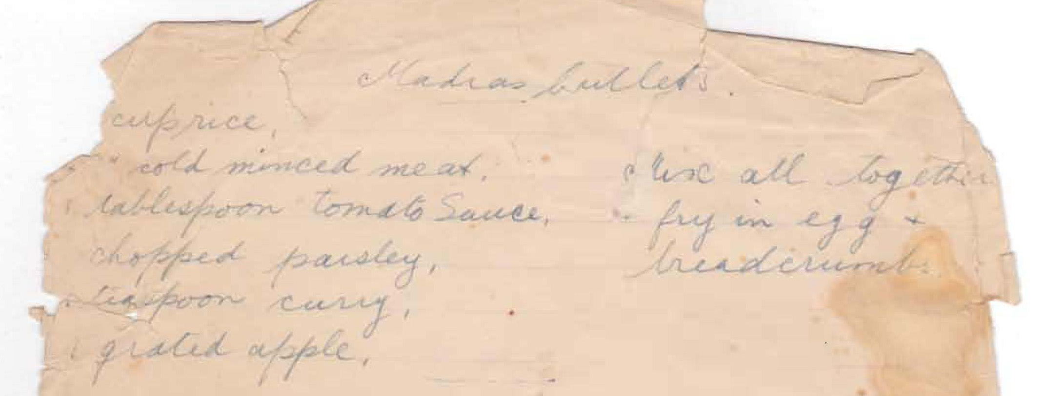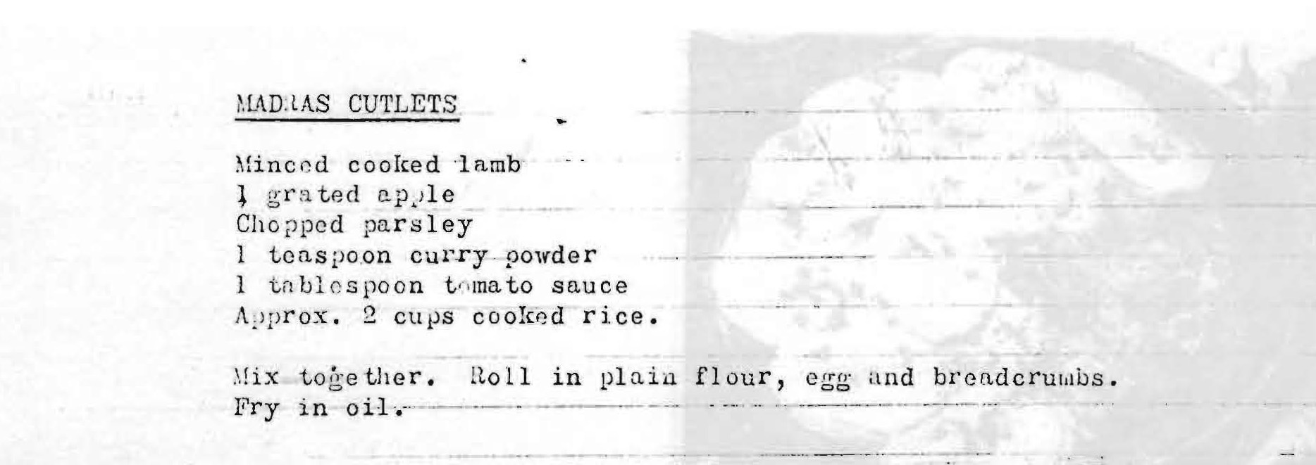 These were one of my father’s favourites and Mum often made them when she had some leftover lamb roast. I’m guessing that she first made them back in the 1940s and after I got married I typed up the recipe and added it to my collection. As Mum’s original is almost impossible to read I’ve included my version here as as well. I’ve no idea why they’re call Madras Cutlets, I suppose the curry powder gave them an exotic Indian flavour!!!