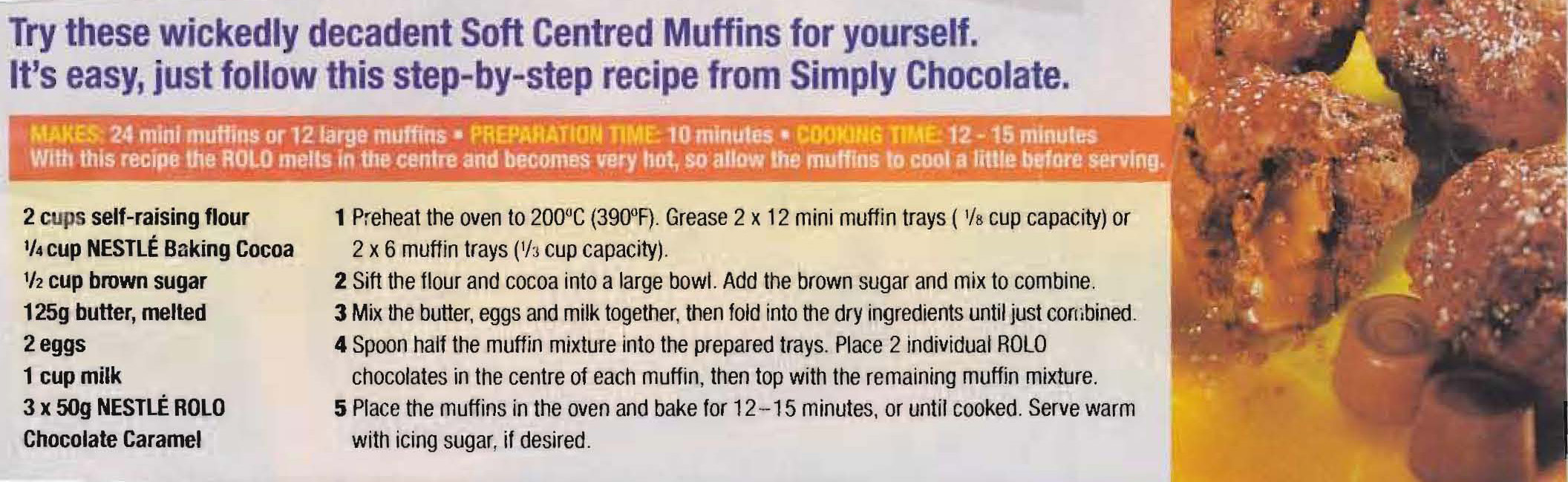 SOFT CENTRED MUFFINS Posted on July 9, 2015 by bebsrecipes This is one for chocolate lovers, of which Mum most definitely was one of. She always bought a block of Cadburys chocolate when it was on special at the supermarket and loved eating a few squares at night after tea. Share this: Click to share on X (Opens in new window) X Click to share on Facebook (Opens in new window) Facebook Like Loading... Related