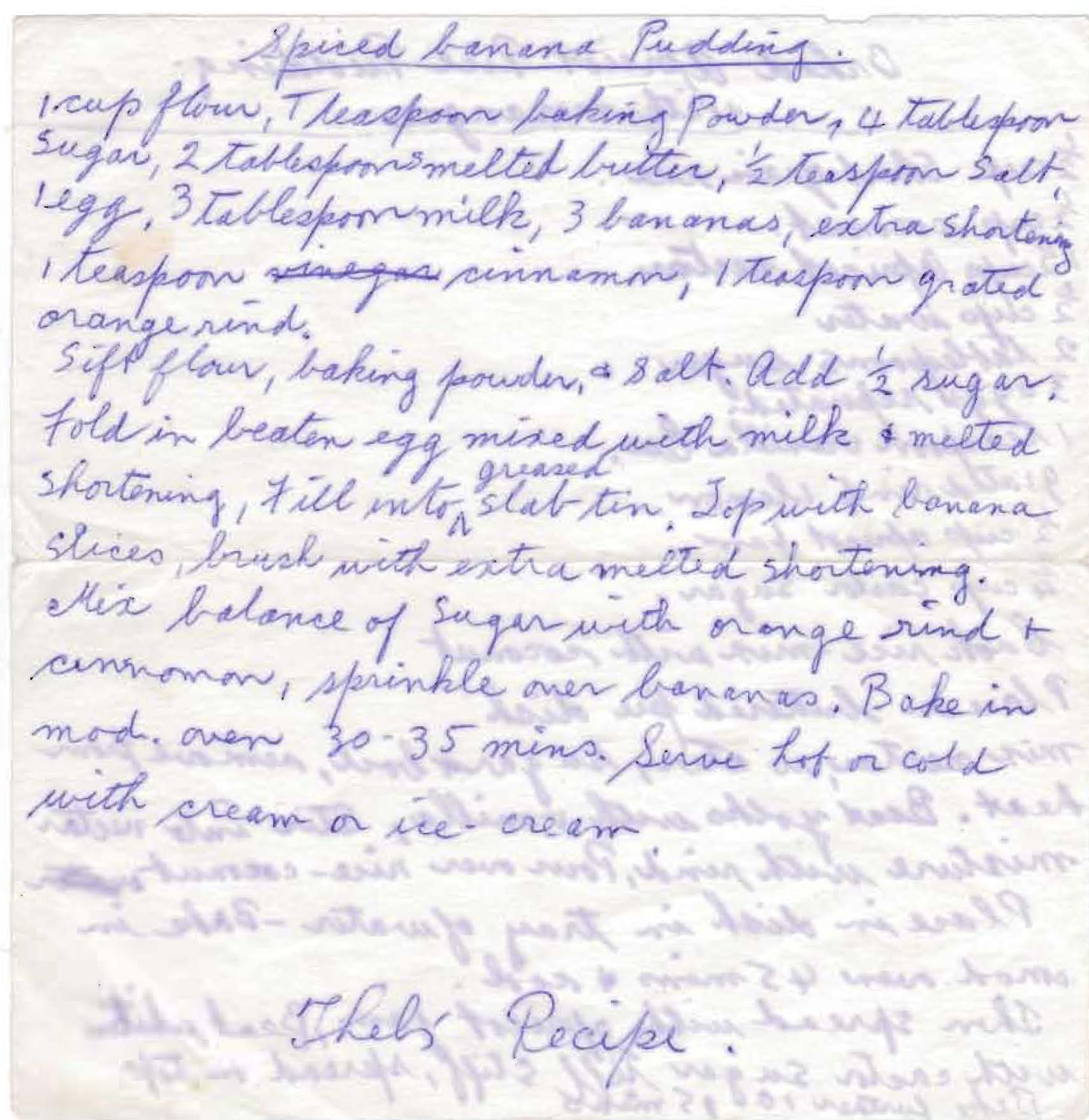 Thel was one of Mum’s golfing friends and a very good cook, there’s a few of her recipes scattered throughout Mum’s collection. This banana pudding would have appealed to Mum as she and Dad both liked bananas, there were always some in the fruit bowl. This pudding would have been a good way to use up those that had ripened just a little too much.