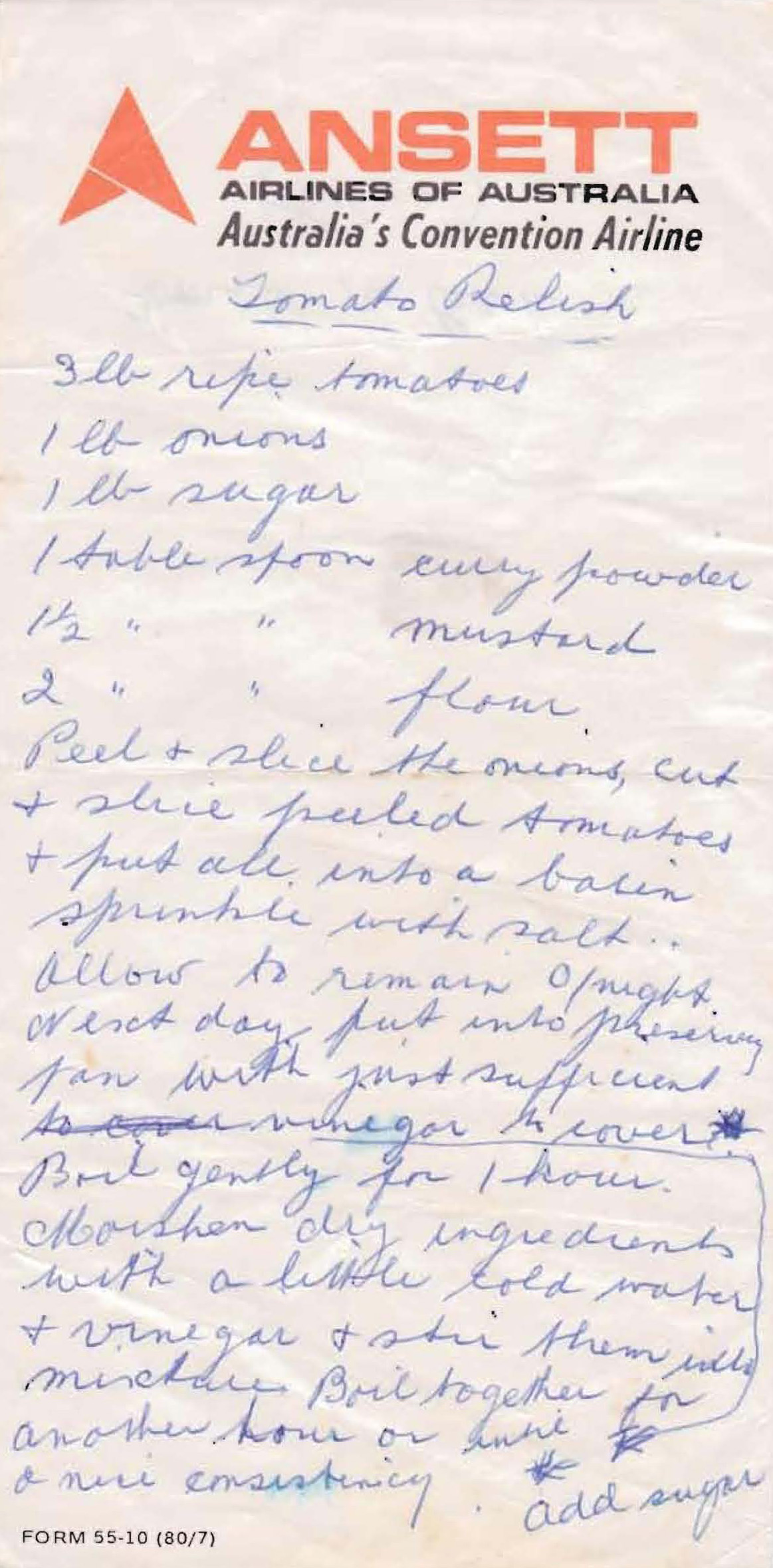 One of the joys of summer when I was growing up was the crop of tomatoes that Dad grew in the backyard. I’m sure today’s tomatoes don’t taste as good. My Uncle Alf had a much larger veggie patch with a lot more tomato plants and vegetables growing. As a result my Auntie Elsie made tomato chutney, pickles and relish in abundance each year. This is one of her recipes, written out by Mum on a piece of the now defunct Ansett Airlines notepaper.