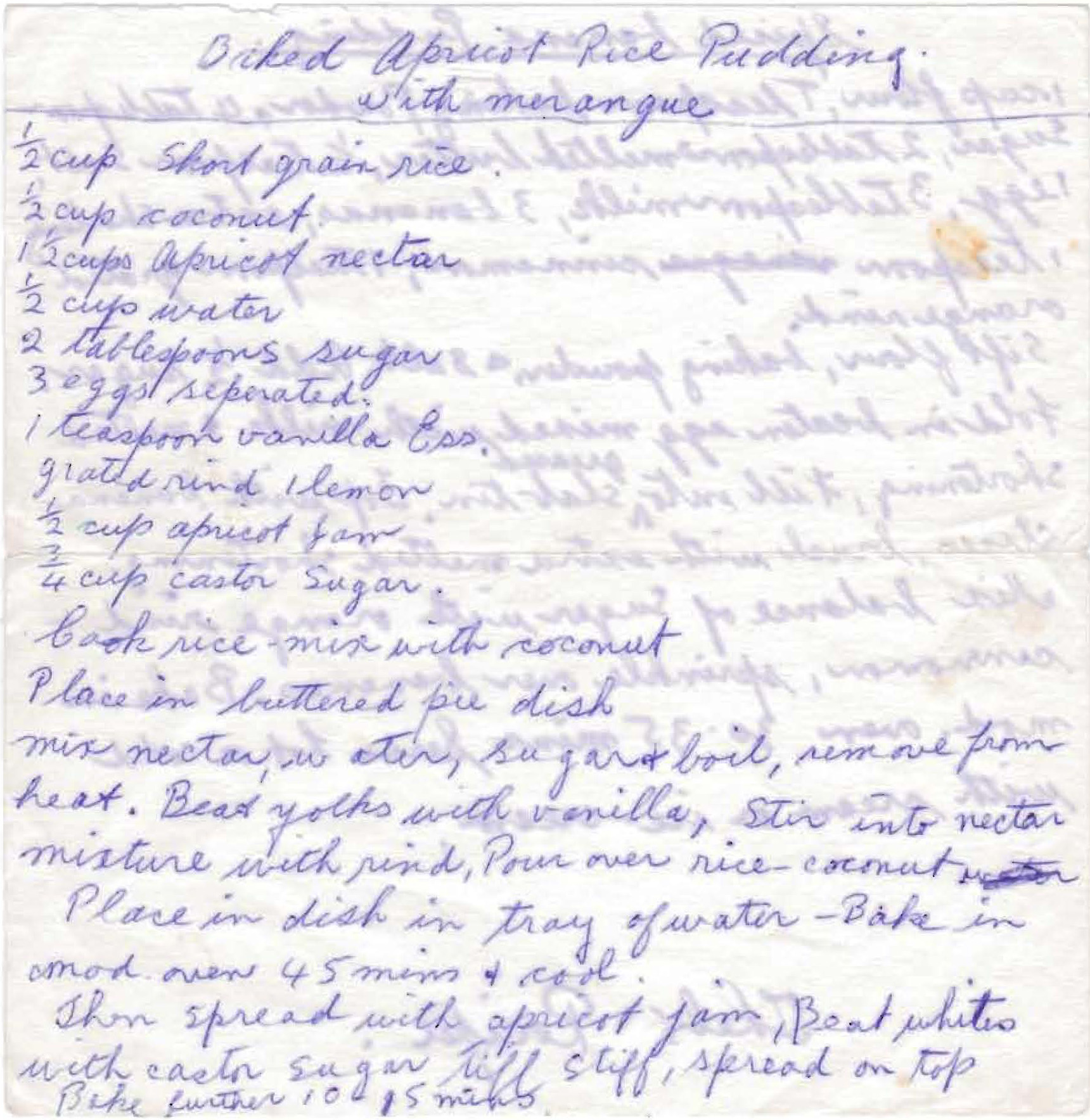 I realize that this handwritten recipe is very hard to read so I’ve typed it out down below. It’s a classic case of Mum writing two recipes on the one piece of paper and the ink blurring through making both recipes really hard to decipher. The recipe itself sounds quite good, if you like apricots that is.