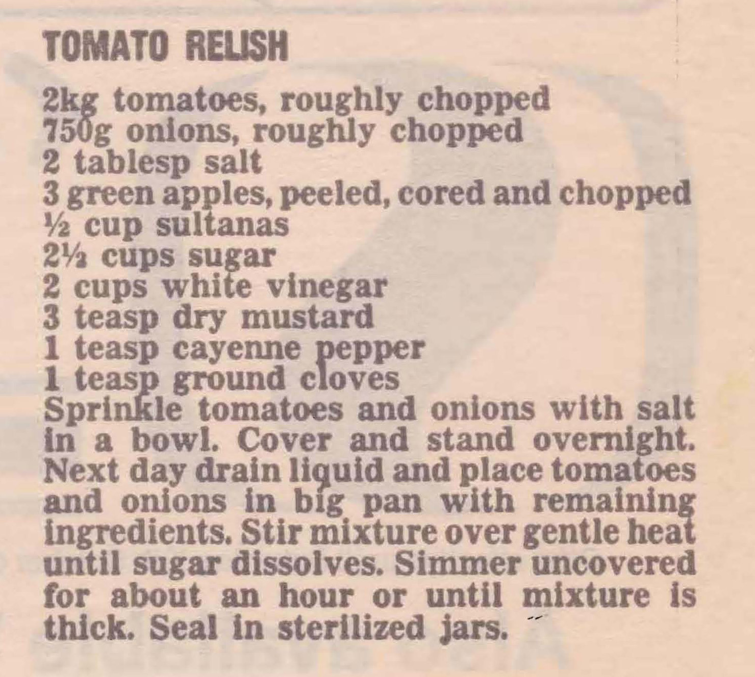 This is another version of Tomato Relish, unlike the other one I posted last year, this one has apples and sultanas added into the mix. It’s still a two day job though, as you need to let the tomatoes and onions sit overnight with the salt on them, before adding the other ingredients and cooking until thick the next day.