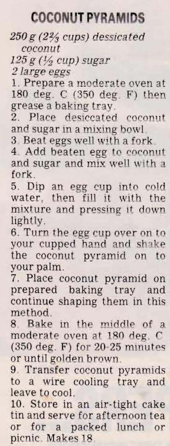 COCONUT PYRAMIDS Posted on March 23, 2017 by bebsrecipes I guess you could rename these Coconut Macaroons, maybe not quite the traditional ones that you make with condensed milk, but still a quick and a gluten free treat for everyone. Share this: Click to share on X (Opens in new window) X Click to share on Facebook (Opens in new window) Facebook Like Loading... Related
