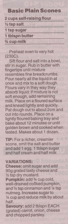 Taking my lead from the Great British Bake Off I feel I have to say – “It’s Scone Week” as I’m going to post five different scone recipes. Mum was a great scone maker so I wasn’t surprised to find this many recipes in her collection. This first one is the basic mix and then Cheese, Pumpkin and Savoury variations.