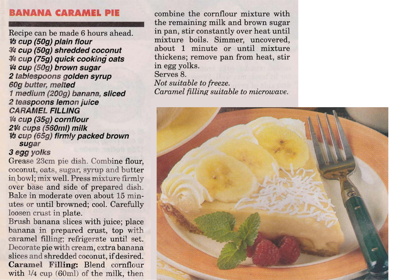 BANANA CARAMEL PIE Posted on July 13, 2017 by bebsrecipes I was looking for a nice warming winter dessert when I found this recipe. It’s probably best served cold, but it might work warm or at least not straight out of the fridge. Share this: Click to share on X (Opens in new window) X Click to share on Facebook (Opens in new window) Facebook Like Loading... Related