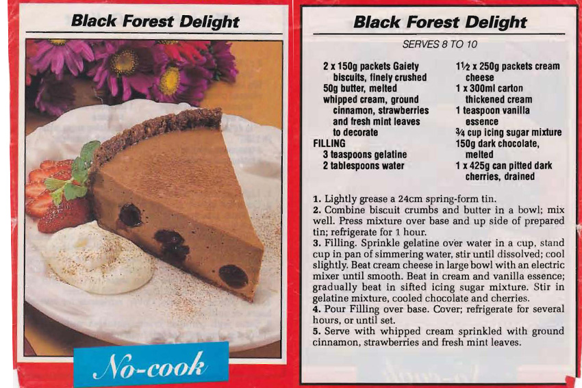 I’m usually not a fan of cheesecake style desserts that use gelatine as a setting agent, but in this case I think the chocolate and cherries add good strong flavours and should make it taste really good. I also like the idea of using Gaiety biscuits for the base.