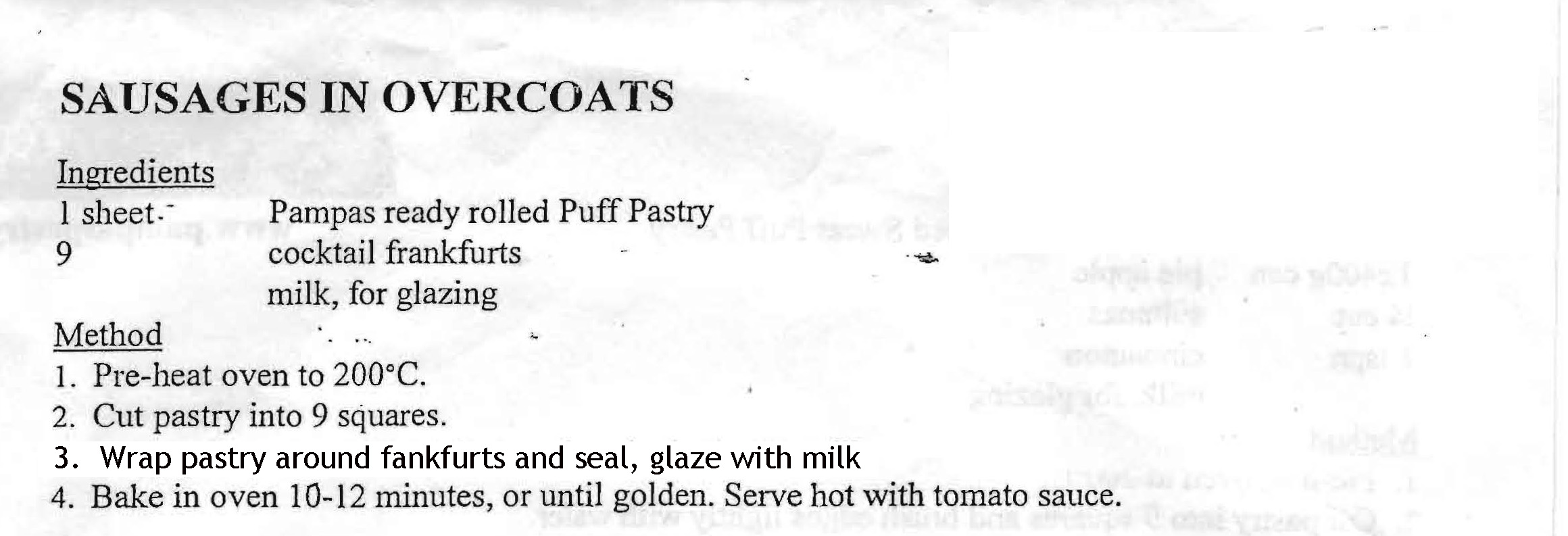 SAUSAGES IN OVERCOATS Posted on October 25, 2017 by bebsrecipes I think you’re supposed to make these for kids parties, but with a bit of luck there’s some left over for the adults. They’re best using cocktail frankfurts, but you can use chipolata sausages if you prefer. Share this: Click to share on X (Opens in new window) X Click to share on Facebook (Opens in new window) Facebook Like Loading... Related