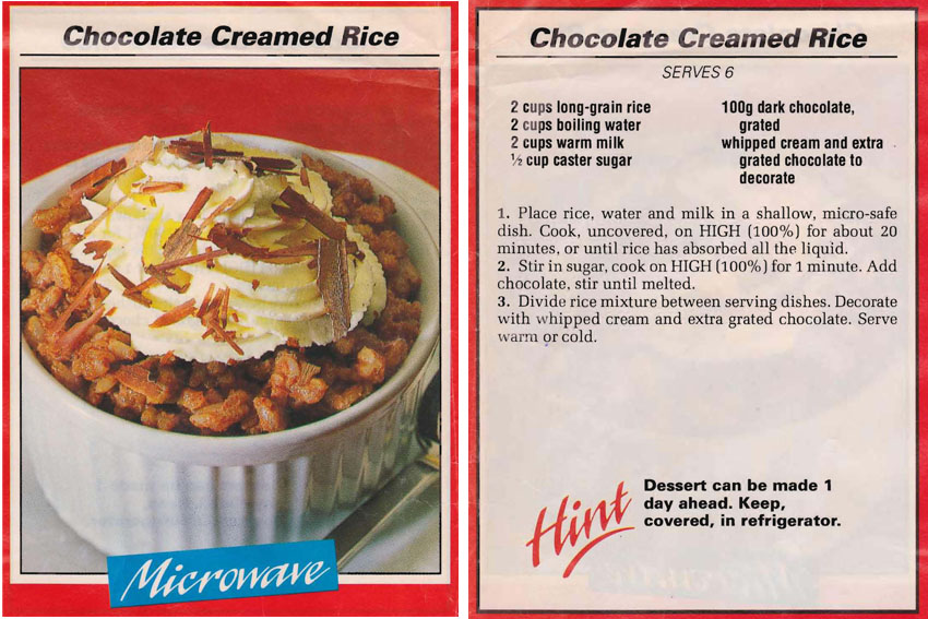 This recipe was published in the Woman’s Day in 1991 and uses a microwave to cook the rice. I think it would work even better if you cooked it in a rice cooker. I’d make sure I washed the rice before using it and I’d substitute cream for some of the water & milk. I think then you’d have a lovely creamy, chocolaty mix.