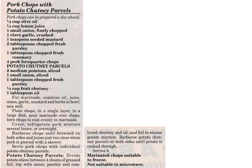 Pork is a great barbecued. We usually just marinade it, but this recipe goes a step further by wrapping the marinades pieces in foil and adding potatoes and chutney. I don’t think it really matters which cut of pork you use and if you don’t want to barbecue you can always cook it in the oven.