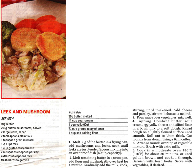 LEEK AND MUSHROOM CRUSTY CASSEROLE Posted on November 5, 2018 by bebsrecipes This comes from a Woman’s Day Upper Crust Treats segment. It’s a quite hearty vegetarian casserole, but I think non-vegetarians will enjoy it as well, especially the crusty topping. Share this: Click to share on X (Opens in new window) X Click to share on Facebook (Opens in new window) Facebook Like Loading... Related
