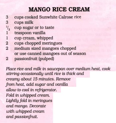 The two big desserts when I was growing up were – Baked Custard and Creamed Rice. My father hated creamed rice, so Mum certainly never made this recipe. Can’t say I’m a great fan of it myself, but I think adding mangoes, whipped cream and meringues definitely makes it more appealing.