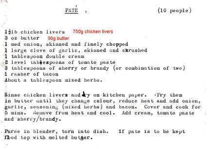 You can see from the typing that this is an old recipe. I used to make it back in the 70s and 80s and serve it as an entree with thin slices of toast. It was cheap and easy to make – ideal. I rediscovered it this year and now make it to have with drinks. It freezes well so I just put out what I need and keep the rest for later. If you don’t want to do that you can easily halve the recipe.