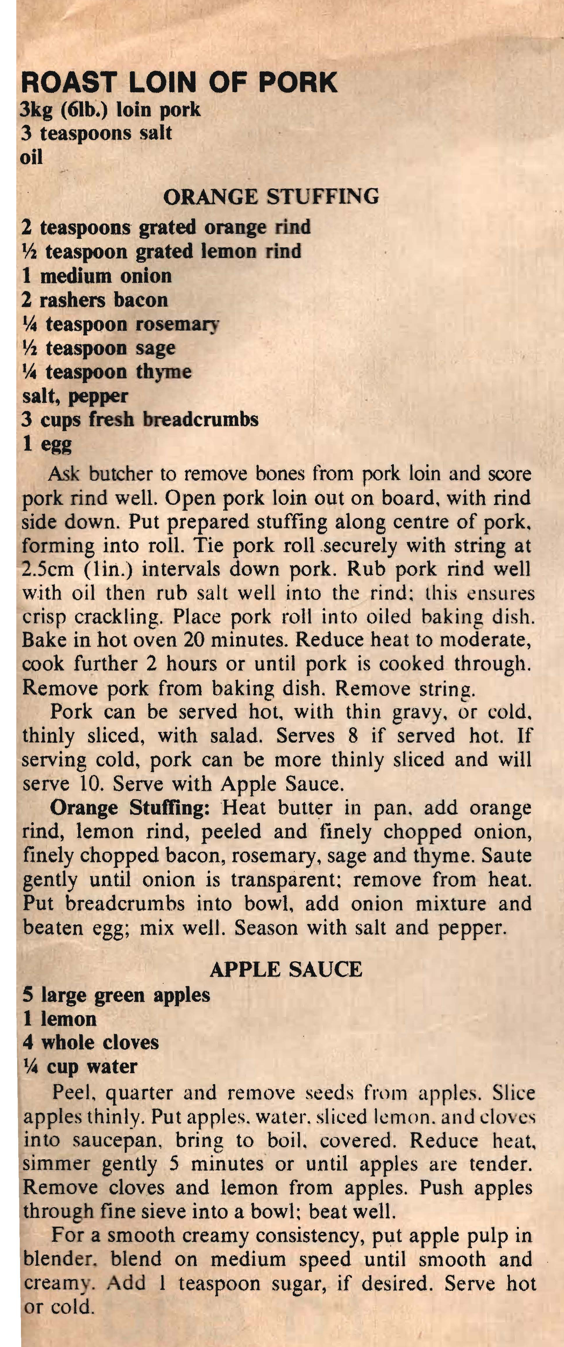 I think this recipe, published by the Women’ Weekly in 1974, shows how differently we buy meat these days – no need to ask the butcher to remove the bones, its already done for you now. That’s great, but I don’t like the way its wrapped in netting. I find that it sticks to the crackling and is hard to get off. Laying the meat out, stuffing it and then tying it with cooking string like this recipe suggests is a much better idea. I’ve included the apple sauce recipe although it’s not like Mum’s version. She left out the cloves and lemon and always put a knob of butter in after she’d pureed it.