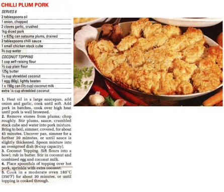 CHILLI PLUM PORK Posted on February 22, 2019 by bebsrecipes This isn’t a dish for my family as they don’t like recipes that have a meat and fruit combination, which is a shame as I think it would be worth trying. The chilli kick in the base and the coconut in the topping certainly add a lot of interest. Share this: Click to share on X (Opens in new window) X Click to share on Facebook (Opens in new window) Facebook Like Loading... Related