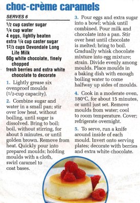 CHOC-CREME CARAMELS Posted on March 13, 2019 by bebsrecipes I know white chocolate isn’t everybody’s favourite, but this little dessert with it’s caramel sauce and topped with raspberries might just change their minds. Share this: Click to share on X (Opens in new window) X Click to share on Facebook (Opens in new window) Facebook Like Loading... Related