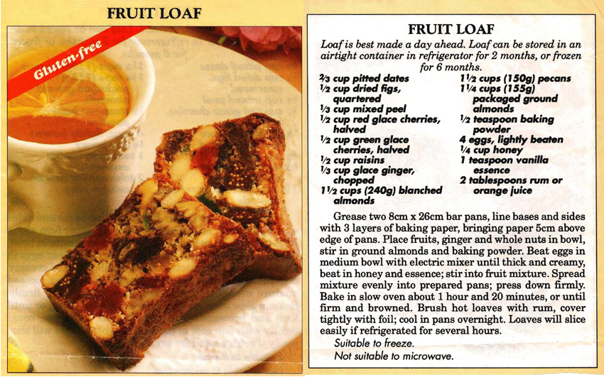 Finding cake recipes that are gluten free is easier in 2019 than it was back in the 1980s, so this fruit loaf was probably very unusual and a joy to find back then. It has the added bonus that it keeps for 2 months and can be frozen – although it wouldn’t be cheap to make. Then what gluten free product is cheap?