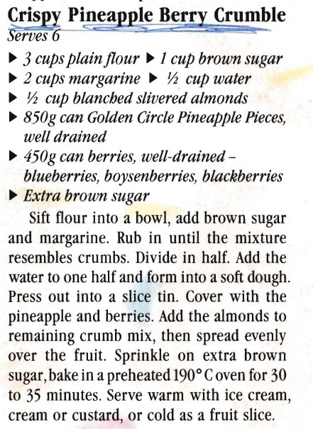 I know tinned pineapple isn’t very popular these days, but back in the 70s it seemed to appear in lots of sweet and savoury dishes.  In going through Mum’s collection I’ve discarded many of them as I just don’t think anyone would want to make them now.  This one seemed to be a bit of an exception mainly, I think, as the berries add a tartness into the mix and that would counteract some of the sweetness of the pineapple, which in my opinion is the main problem with with tinned pineapple. (The biro underlining is Mum’s so she must have thought it would taste OK.)