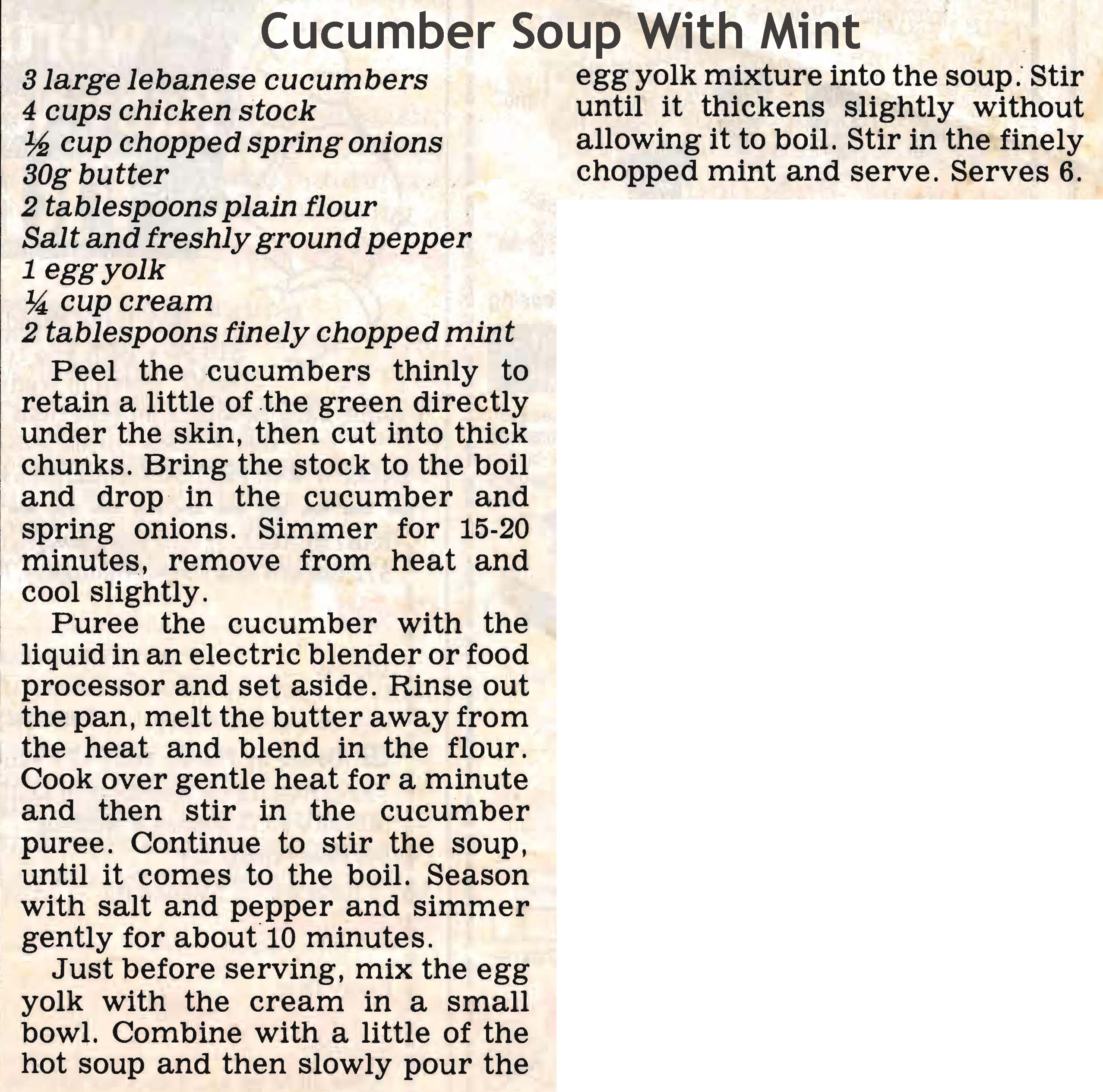The blurb that goes with this New Idea soup recipe says “A lovely soup which can be served hot in the winter months or chilled in the summer”. Personally I don’t think soup should ever be eaten cold, I like it steaming hot, but, I’m willing to accept that it might be to some people’s taste. Either way it’s an unusual way to cook cucumbers…………..
