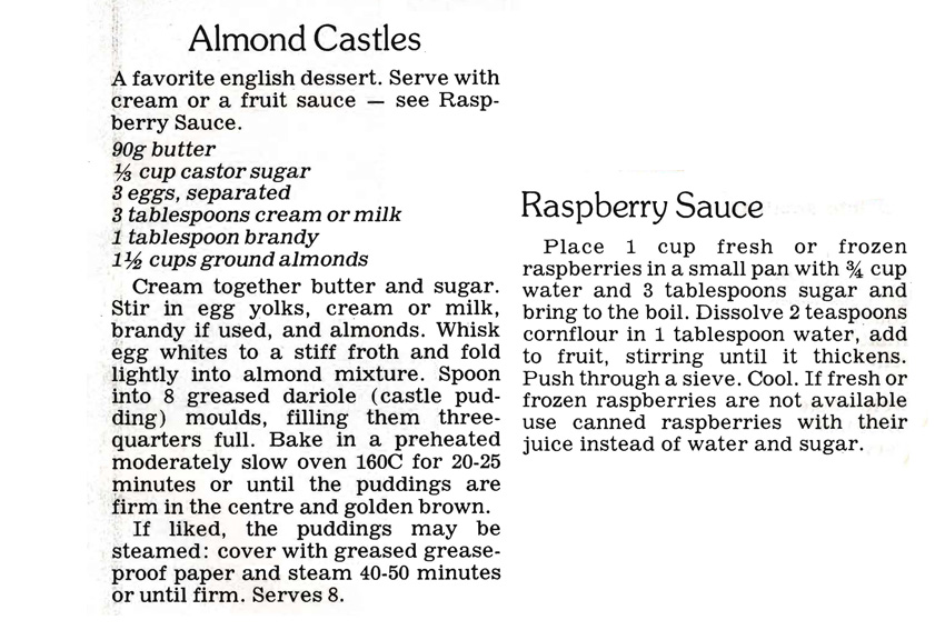 Almond Castles – a favorite english dessert. Is it? I’ve never heard of it and an online search didn’t seem to answer the question. This recipe was on a page of desserts that Mum tore out of a 1991 New Idea. Favorite or not it sounds good, especially with the raspberry sauce and cream.