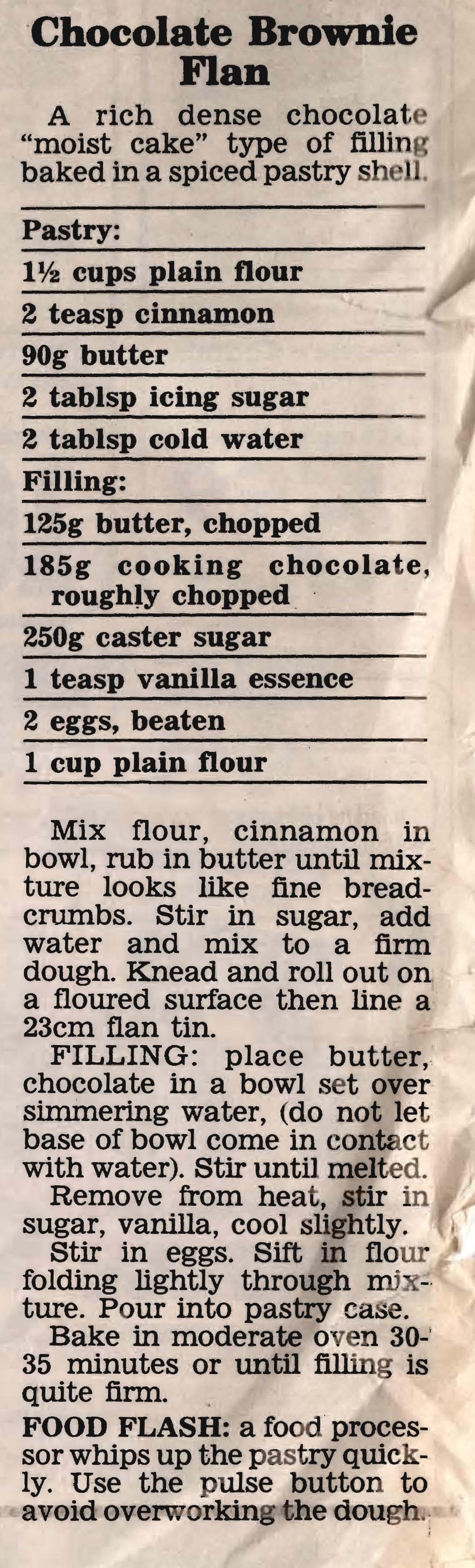 CHOCOLATE BROWNIE FLAN Posted on April 14, 2019 by bebsrecipes Served with lashings of cream this combination of a chocolate brownie in a pastry case would be pretty delicious, although I’m guessing it would be fairly rich – maybe just a small slice? Share this: Click to share on X (Opens in new window) X Click to share on Facebook (Opens in new window) Facebook Like Loading... Related