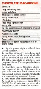 No, this isn’t a recipe for just chocolate macaroons – it’s actually a chocolate dessert with macaroons on top. It’s a new one to me. It’s cooked in individual souffle dishes with a chocolate crumb base, a rich chocolate/coffee sauce and topped with coconut macaroons. Definitely one for the chocolate lovers.