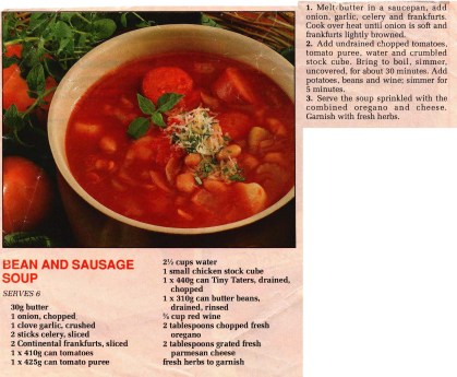 The sky outside is dark and menacing, so what better time to think of making soup. This recipe was published by Woman’s Day in 1991 before chorizo sausage was so readily available. I think substituting it for the frankfurts would give the soup a lot more flavour and I’d also use fresh potato instead of the tinned Tiny Taters, if you can be bothered peeling and cutting them. A nice and hearty boost on a cold winter’s day.