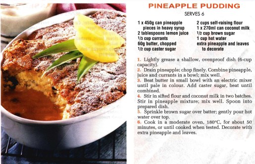 Tinned pineapple isn’t used much these days, but it can still be worthwhile when fresh pineapple is out of season. It’s quite sweet and that can make things with it in a bit too sweet – this pudding breaks that sweetness down with lemon juice though. Haven’t tried it myself, but I think it could be a good family pudding.