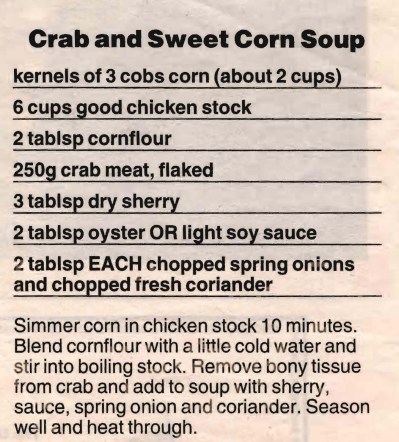 This is a seafood version of the classic chicken and sweet corn soup. I don’t see why you couldn’t use tinned crab meat it would be a lot less fiddly than de-shelling a fresh crab – mightn’t taste quite as good, but it would be a whole lot lot quicker and easier…….
