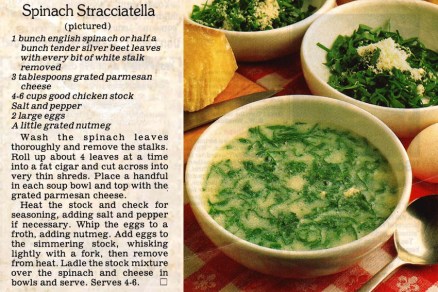 SPINACH STRACCIATELLA Posted on August 5, 2019 by bebsrecipes I’ve never made this Italian egg soup, but I like the idea that unlike a lot of soups it doesn’t need a long time to cook. It would be a great soup to make on a cold night when you want something hot and tasty very quickly. Share this: Click to share on X (Opens in new window) X Click to share on Facebook (Opens in new window) Facebook Like Loading... Related