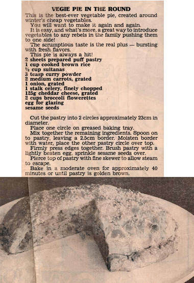 This 1991 recipe published in the Checkout column of the Herald Sun is a bit of a mixture of the old and the new. Brown rice was only just starting to become popular around that time, but the old style curry powder, vegetables and sultanas mix is what curries looked like in most households then. Old fashioned maybe, but still a good vegetarian pie.