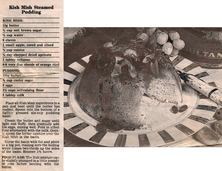 According to the Herald Sun Checkout column, where this recipe appeared in June 1993, ‘Kish Mish is a sensational concoction of dried fruits and spices – it can stand alone as a dessert served with cream, but for winter you can serve it as a cascade over steamed pudding’. I think the thing that makes it a bit different is the addition of apple with the dried fruit, it would be really fruity and moist.