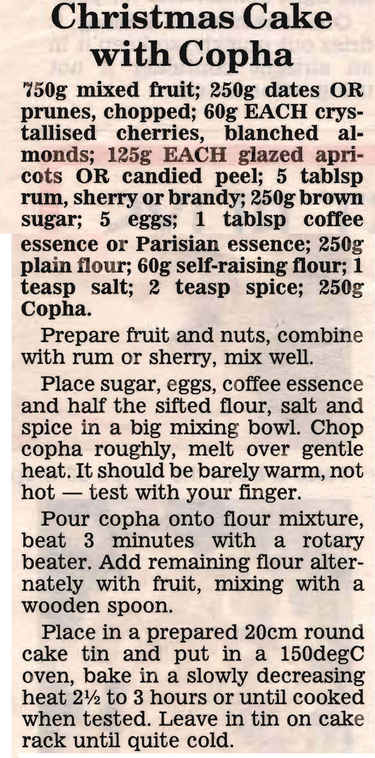Back in the day Christmas cakes and pudding were often made using lard, but that’s not easy to get these days and most recipes use butter instead. This cake substitutes copha for lard. I haven’t made it, but think I might do it next year as it sounds interesting.