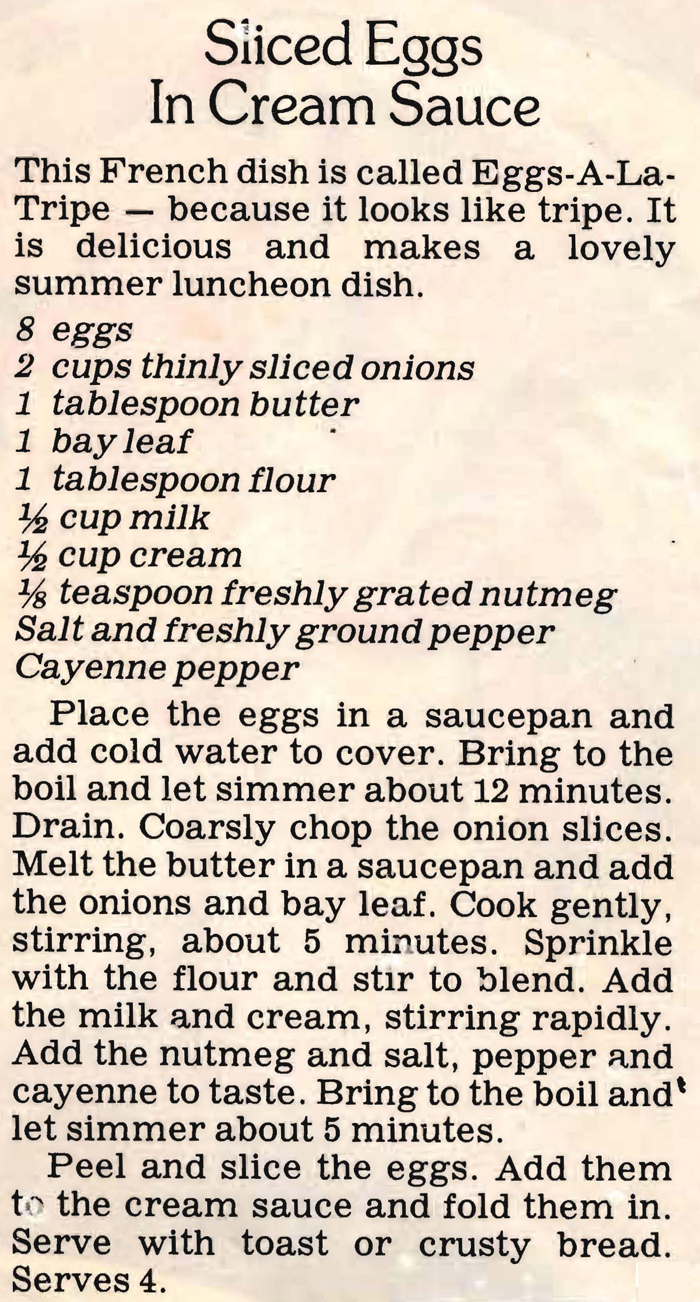 Or in French, Oeufs a la tripe………. I think it’s been translated without the word tripe in the title as, if you’re like me, that conjures up quite unpleasant childhood memories of a flabby, tasteless blob covered in white sauce. I’d much prefer this variety, although I think a bit of cheese, maybe gruyere, would make it even better.