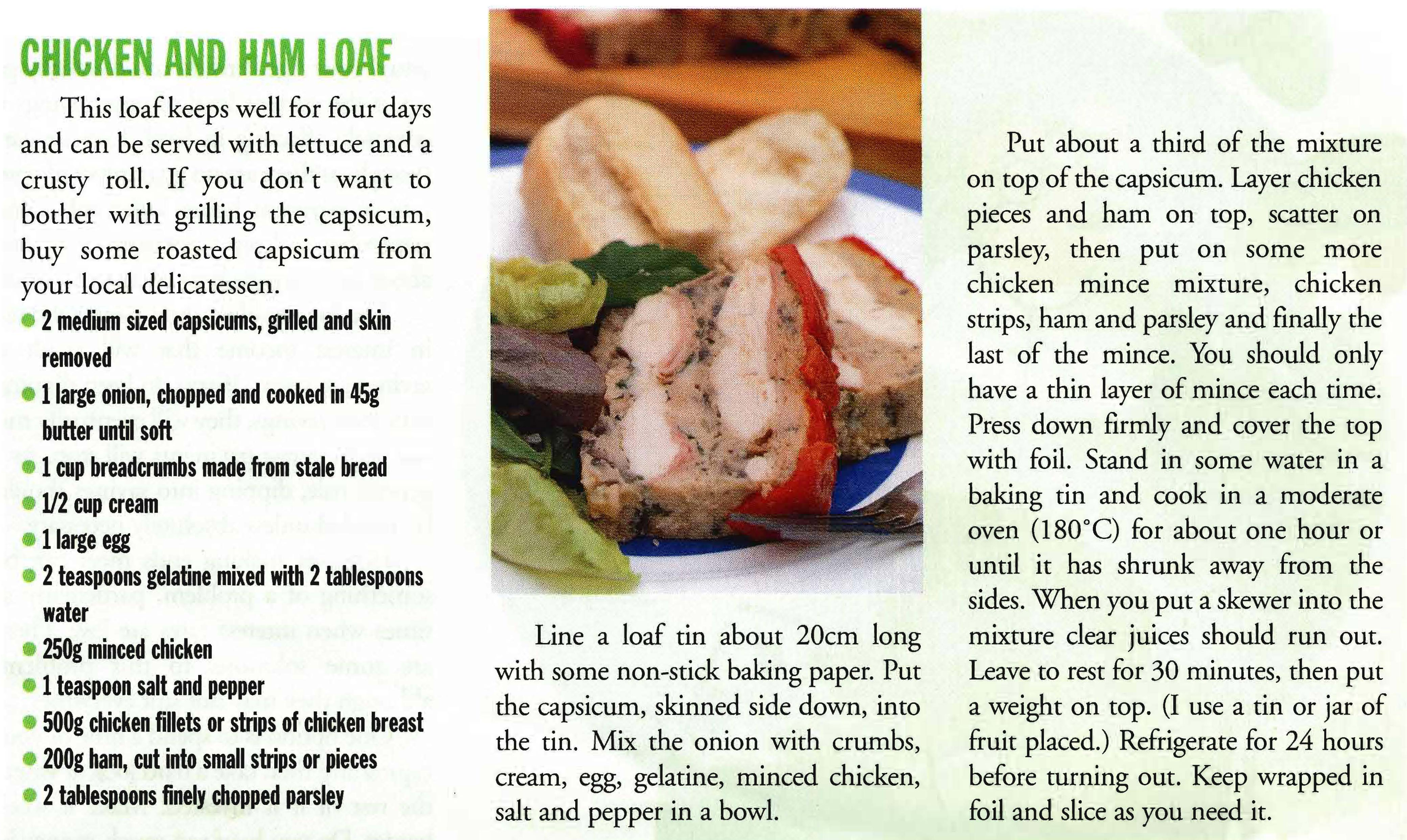 CHICKEN AND HAM LOAF Posted on February 29, 2020 by bebsrecipes This chicken and ham loaf is fairly versatile. It looks so good you could serve it, as suggested, on a crusty roll, or as an entree, or just with a salad or even as part of an antipasti platter. Lots of choices really……….. Share this: Click to share on X (Opens in new window) X Click to share on Facebook (Opens in new window) Facebook Like Loading... Related