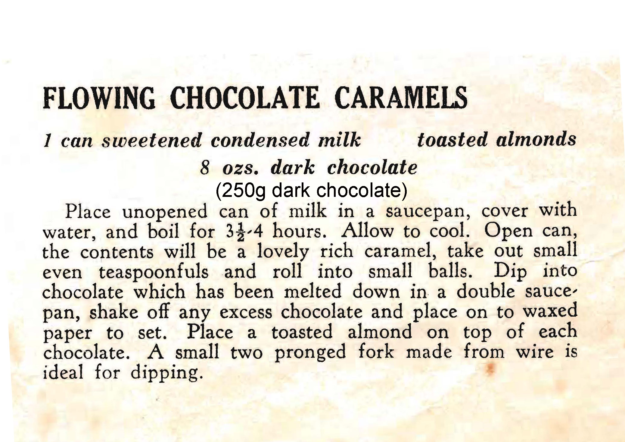 This is an old 1950s (or thereabouts) recipe for chocolate covered caramel balls. With the schools shutting down for an extended time it could be a project for the kids. Obviously, they’ll need supervision with cooking the tin of condensed milk, but the rolling out of the balls could be a fun and messy job for them.