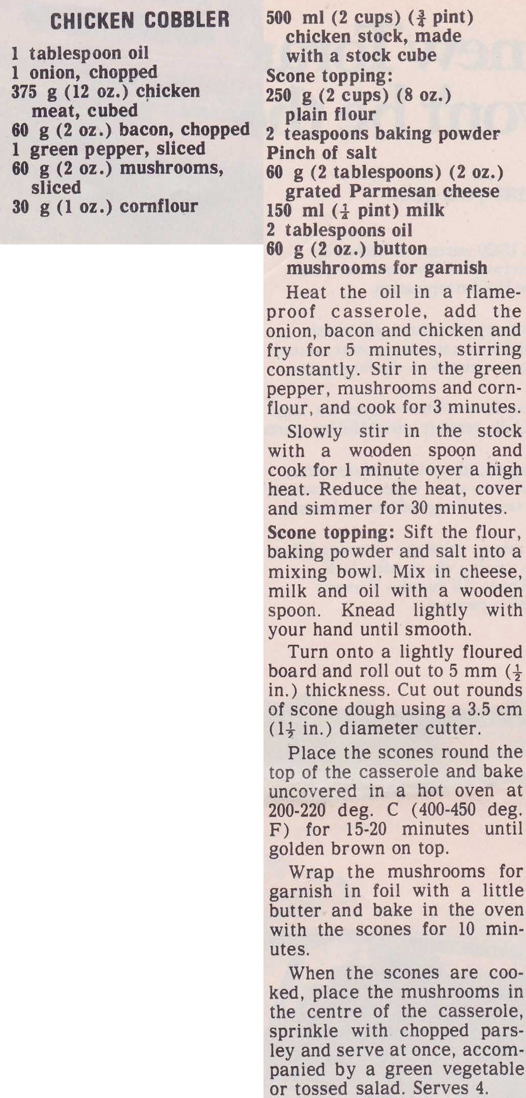 The cheesy scone topping on this chicken casserole makes this a hearty and inexpensive meal. It comes from a New Idea supplement entitled ‘Tasty Meals on a Budget’, published in 1974 and shows weights in metric and the old imperial measurement. Although metric conversion happened in 1966 it took sometime for home cooks to become confident of using the new system.