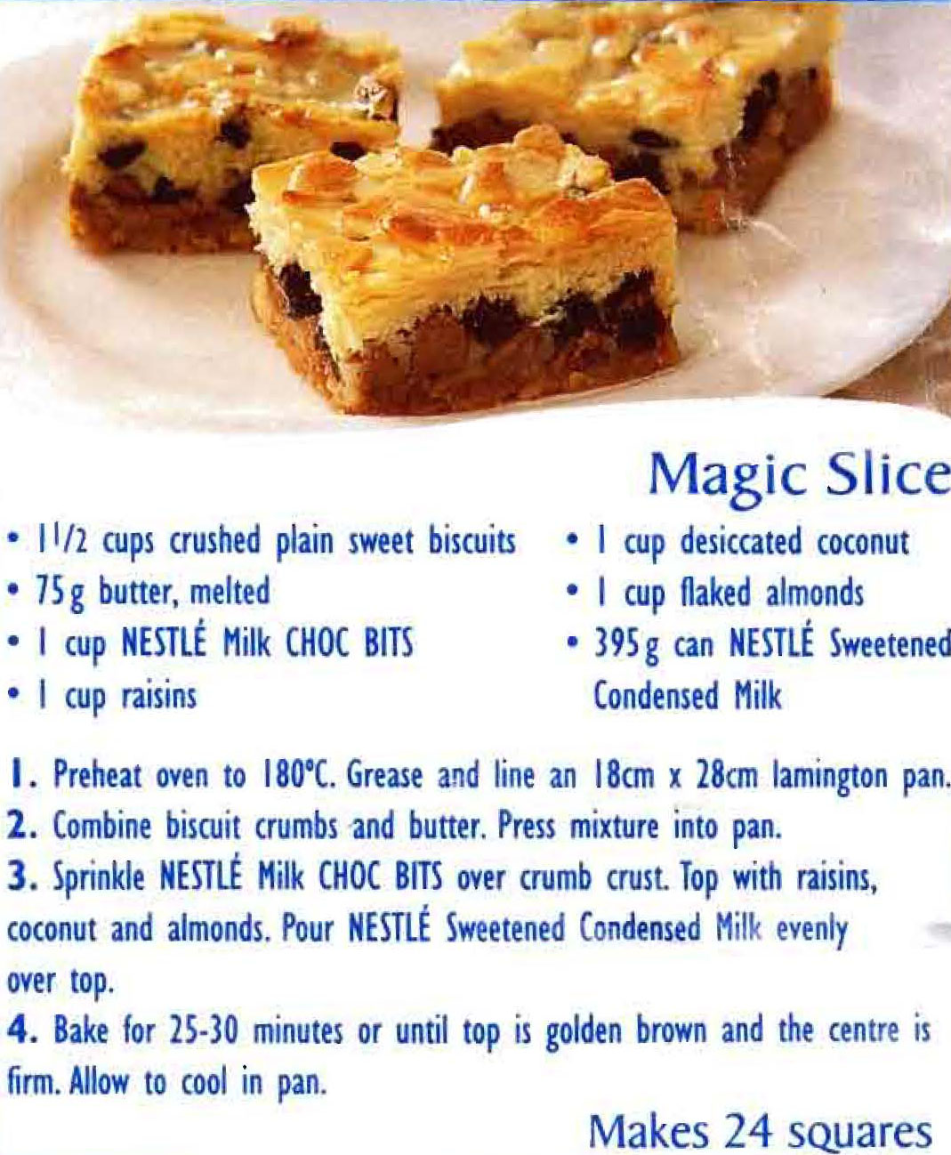 You can probably see that this recipe was one Mum saved from the label on a tin of sweetened condensed milk. I thought slices and biscuits using sweetened condensed milk had gone out of fashion, but maybe not, as during this Covid crisis it’s been one of the items that’s been hard to get at my supermarket. Maybe that’s because, like this recipe, slices and biscuits using it are usually fairly quick and easy to make. Great for baking and eating while stuck at home…………
