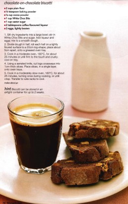 CHOCOLATE-ON-CHOCOLATE BISCOTTI Posted on October 1, 2020 by bebsrecipes Coffee and biscotti time!!!! If you can’t get out to buy your favourite what about having a go at this twice baked treat. Easy to make, you just need a bit of patience to wait while it’s baked and cools before you can sample it. Share this: Click to share on X (Opens in new window) X Click to share on Facebook (Opens in new window) Facebook Like Loading... Related