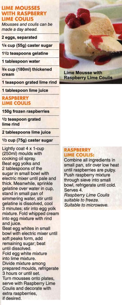 When I was growing up everyone had a lemon tree in their backyard. No one would have thought of having a lime tree, but like many people we now have one as well as the lemon in ours. Hopefully we’ll have enough of a crop this year to be able to make this luscious dessert.