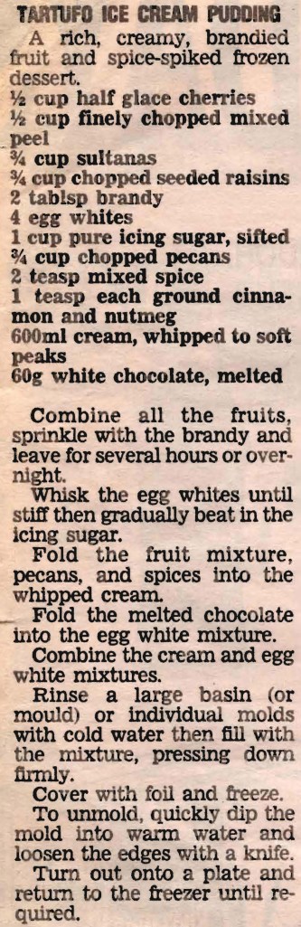 The frozen Christmas pudding I usually make has an ice cream base. This one is a little bit different, it still has decadent brandy soaked fruit, but also has lashings of cream, some white chocolate and meringue. I’ve already made a boiled pudding for this year, but think I might give this one a go next year.